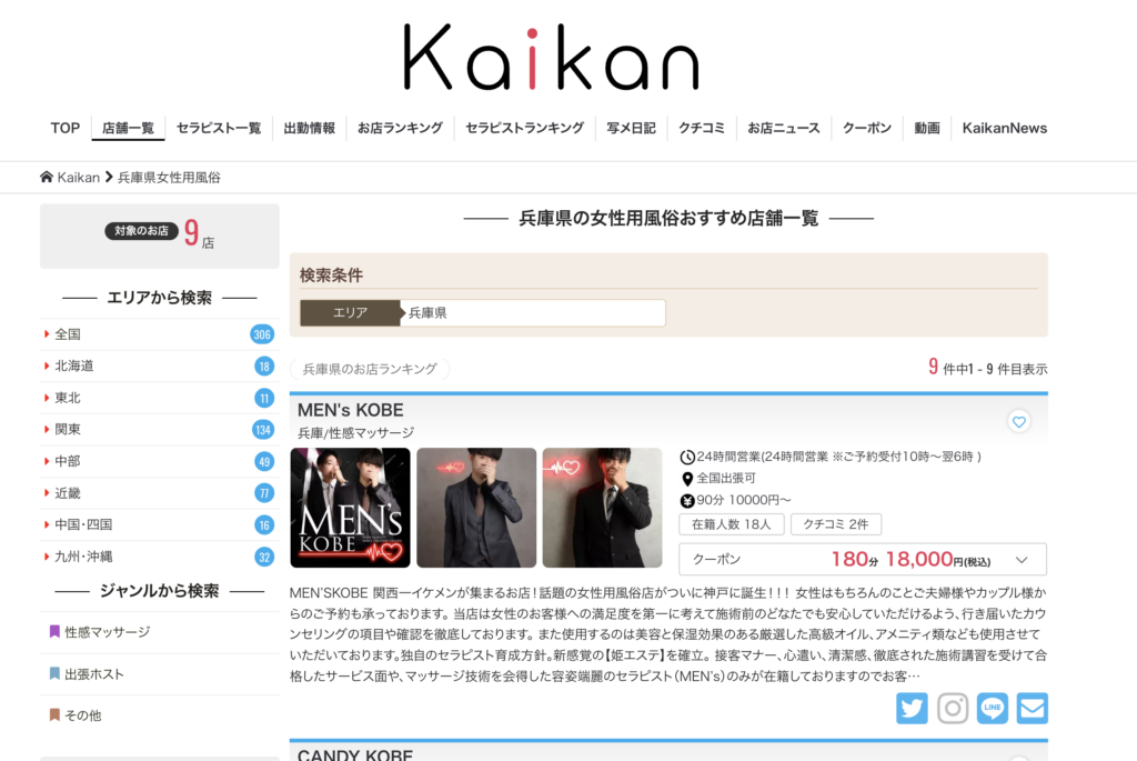 100万人を超える人口を持つ大都市神戸だけあって、全国展開している女性用風俗のお店も多数出店しているようです。