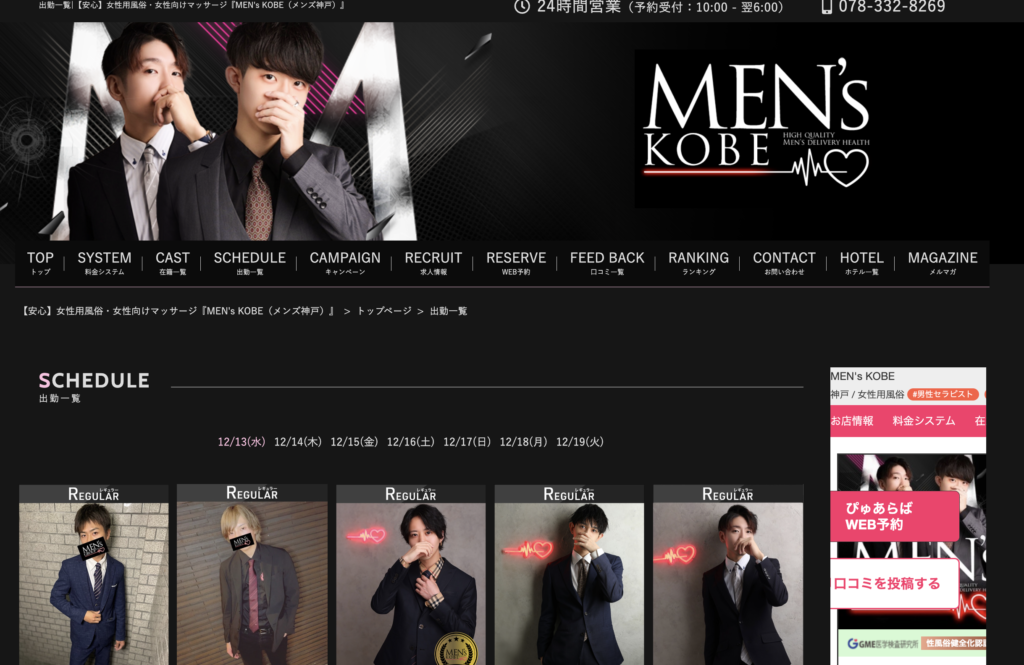 最初はMEN’S KOBEをご紹介します。グループ店ですが神戸を拠点に営業しており、兵庫出身のご当地セラピストも多く存在している印象。